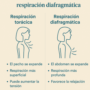 Cuando estamos agobiados, respiramos con el pecho. Esto aumenta la tensión muscular y nos mantiene en alerta. La respiración abdominal te ayuda a activar la calma y a relajar hombros y cuello.
